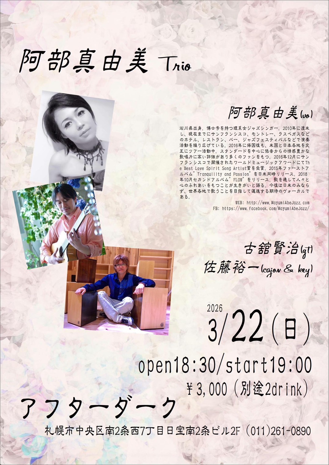 2026年3月22日(日) 18:30open 19:00start 北海道・札幌 「アフターダーク」 Music Charge : ¥3,000(別途2drink) 阿部真由美(vo), 古舘賢治(g), 佐藤裕一(cj&key) 札幌市中央区南2条西7丁目日宝南2条ビル2F Phone: 011-261-0890 ブログ